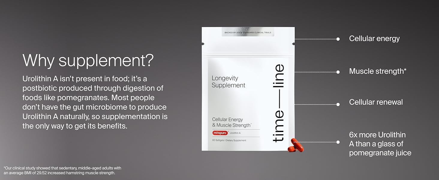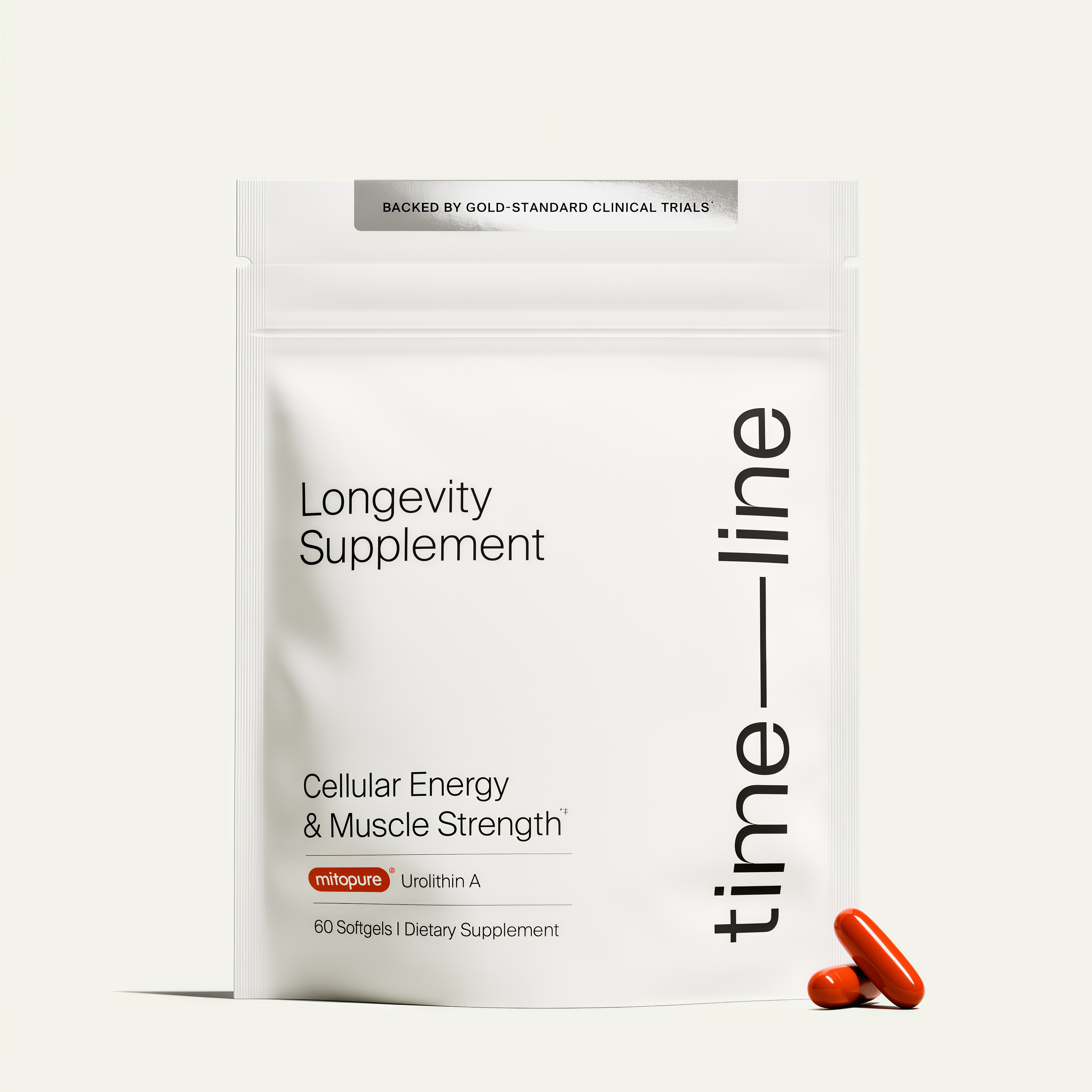 Mitopure (Urolithin A) is the active proprietary ingredient inside Timeline products. This novel postbiotic nutrient is clinically proven to boost cellular energy and muscle health by renewing mitochondria*.